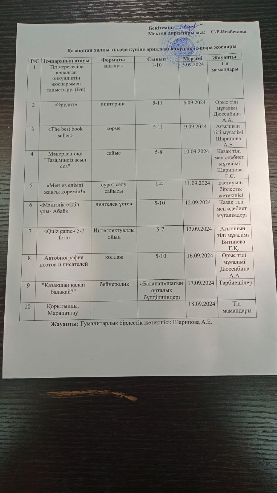 Қазақстан халқы тілдері күніне арналған онкүндік аясында 5 қыркүйек күні Тіл мерекесіне арналған онкүндік жоспарымен таныстырылды.